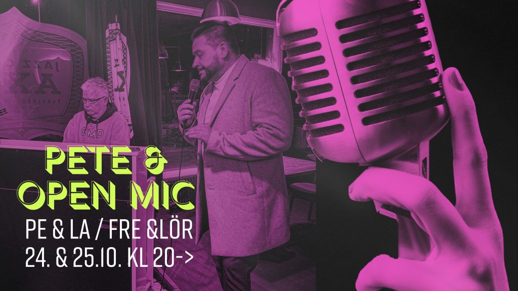 Ta med noter – eller kom utan, Pete har lovat att ackompanjera vid behov. Båda kvällarna, alltså fre 24 och lör 25.10 från och med kl. 20.