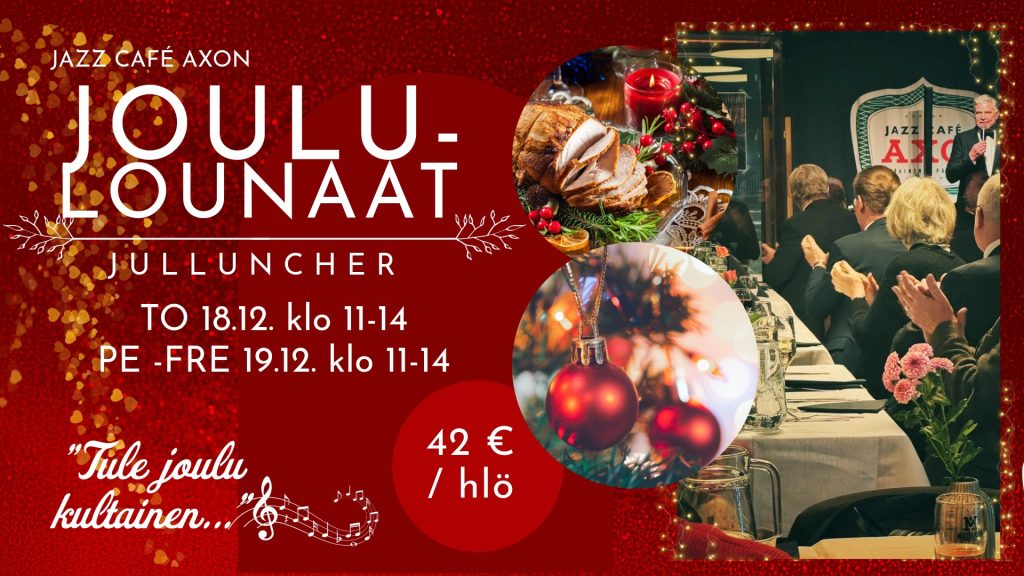Jazz Café AXOs julbord serveras torsdag 18.12 och fredag 19.12 kl. 11–14. Boka bord i förväg på jazzcafeaxo@gmail.com senast måndagen den 15.12. Lunchen kan också köpas i vår webbutik.