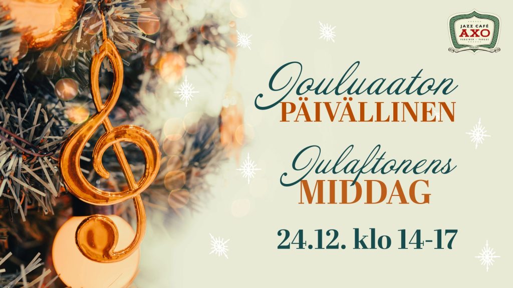 Jazz Café AXOs rikliga julbord serveras också på julafton den 24.12 kl. 14–17. Kom och njut av ett festligt julmiddag i vackert dukade bord, fullt av traditionella julsmaker och stämningsfull julmusik. Gör din bordsbokning på jazzcafeaxo@gmail.com