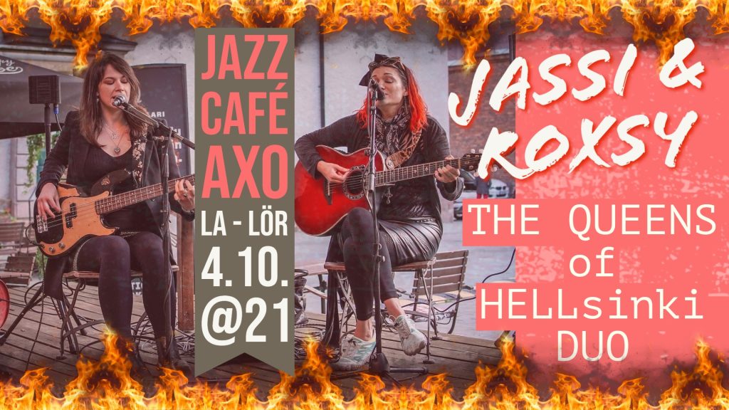 Tulevana lauantaina saamme jälleen nauttia naisrock-energiasta, kun Jazz Café AXOn lauantain liveviihteestä huolehtii duo The Queens of Hellsinki eli Jasmine Wynants’n (BE) (lead vox+ gtr), ja Roxsy Surowiak’n (UK) (back. vox + bass).