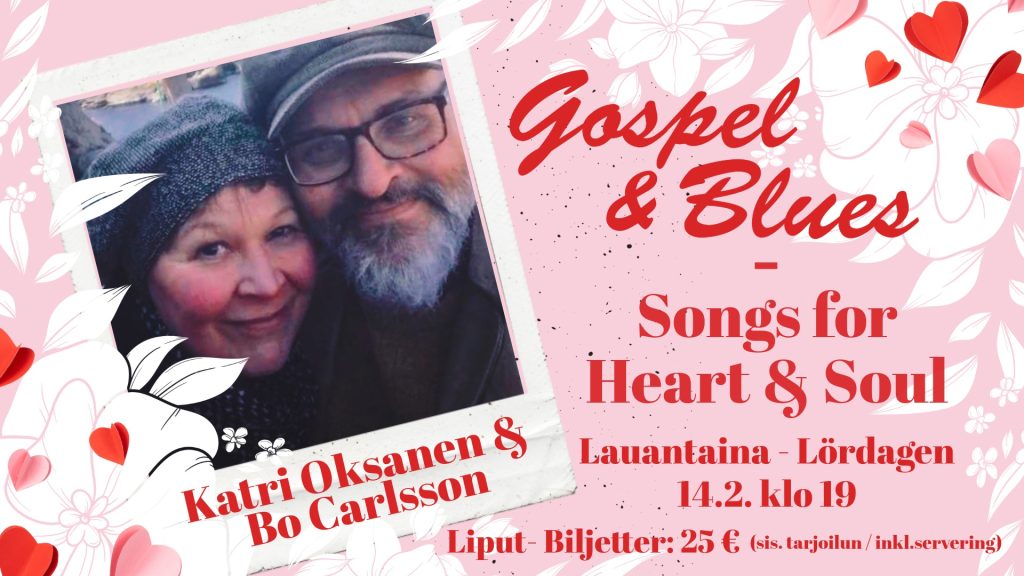 Pariskunta Katri Oksanen ja Bo Carlsson, joka tunnetaan myös ruotsalaisen bluesyhtye Mr. Bo & The Voodooers yhtyeen karismaattisena solistina, tarjoilevat yhtä aikaa väkevän ja koskettavan gospel & blues-illan rakkausteemalla ystävänpäivänä 14.2. klo 19.