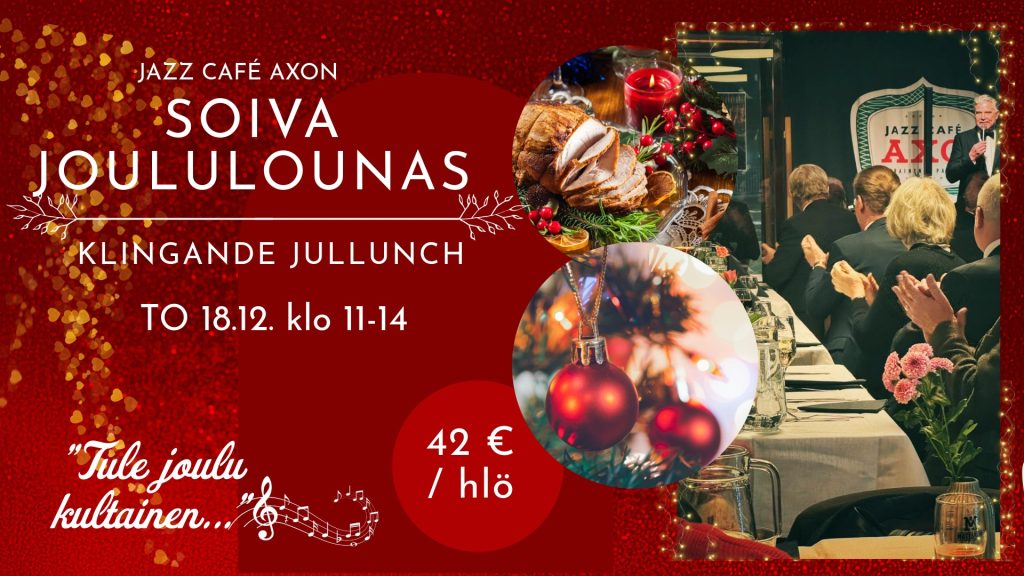Jazz Café AXOn runsas joulupöytä on tarjolla myös jouluaattona 24.12. klo 14-17. Tule nauttimaan kauniisti katetuista pöydistä juhlava joulupäivällinen, joka on täynnä perinteisiä joulumakuja ja tunnelmallista joulumusiikkia. Tee pöytävaraukset osoitteessa jazzcafeaxo@gmail.com 19.12. mennessä. Päivällinen toteutuu, jos varauksia on vähintään 10. Joulupäivällinen on ostettavissa myös verkkokaupastamme: https://jazz-cafe-axo.sumupstore.com/tuote/jazz-cafe-axon-jouluaaton-paivallinen